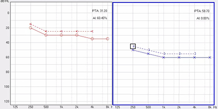 <span style="font-size:16px;"> 純音聽閾測試是聽力學(xué)所有測試項目中最基本的一項內(nèi)容,包括氣導(dǎo)(AC)、骨導(dǎo)(BC)、最舒適閾(MCL)與不舒適閾(UCL)測試。測試結(jié)果能夠直接反映患者雙耳的聽力損失程度、性質(zhì)與動態(tài)范圍,還能夠間接反映患者的患病位置、病因與助聽后效果。</span></p><p><span style="font-size:16px;"> 一般地,整個檢查控制在10分鐘左右,既能全面做完檢查,又不至患者疲憊而影響主觀反應(yīng)。</span></p><p><span style="font-size:16px;"> 純音聽閾測試是最考驗聽力學(xué)工作者實際工作能力的一項基本內(nèi)容:</span></p><p><span style="font-size:16px;"> 1、若患者曾長期暴露于噪聲中,且無其它致聾因素,很可能在3 kHz或6 kHz出現(xiàn)明顯的下降,聽力曲線呈現(xiàn)“V”字形,所以除了常規(guī)的倍頻程頻率外,還要加測這兩個頻率,否則就犧牲了多通道助聽器的意義;</span></p><p><span style="font-size:16px;"> 除了有過噪聲接觸史的患者需要加測半倍頻程外,涉及聲場助聽聽閾評估、賠償?shù)惹闆r都需要加測半倍頻程。</span></p><p><span style="font-size:16px;"> 耳鳴困擾的患者,注意避免與耳鳴聲類似的純音,若還用純音作為刺激聲,患者就會分辨不清,出現(xiàn)假陽性或假陰性。所以,測試者要換成囀音,既有別于耳鳴聲,又具有頻率特異性。</span></p><p><span style="font-size:16px;"> 2、不舒適閾反映患者對大聲的忍耐力,不舒適閾與氣導(dǎo)的差值能顯示患者的動態(tài)范圍,指導(dǎo)驗配師調(diào)節(jié)助聽器的最大輸出。</span></p><p><span style="font-size:16px;"> 不舒適閾測試頻率是否越多越好呢?非也。測得頻率過多,一會引起患者疲勞或不適,二是沒必要,大多數(shù)助聽器的最大輸出是一個整體,不能像調(diào)增益和壓縮那樣分通道,所以測多了并無好處,一般測0.5、1、2、4 kHz。</span></p><p><span style="font-size:16px;"> 3、如果兩側(cè)聽力有明顯差異,此時就要準(zhǔn)備好掩蔽了,分為氣導(dǎo)掩蔽與骨導(dǎo)掩蔽。</span></p><p><span style="font-size:16px;"> (1)氣導(dǎo)掩蔽的判斷有兩個原則,只要符合其中一個原則,就需要重新測差耳氣導(dǎo)。具體做法是:</span></p><p><span style="font-size:16px;"> 測試完雙耳氣導(dǎo),若發(fā)現(xiàn)某一頻率差耳氣導(dǎo)閾值比好耳氣導(dǎo)閾值多40 dB以上就要懷疑有可能是好耳偷聽的,需要給好耳氣導(dǎo)加掩蔽聲;</span></p><p><span style="font-size:16px;"> 測試完雙耳氣導(dǎo)與好耳骨導(dǎo),若發(fā)現(xiàn)某一頻率差耳氣導(dǎo)閾值比好耳骨導(dǎo)閾值多40 dB以上就要懷疑有可能是好耳偷聽的,需要給好耳氣導(dǎo)加掩蔽聲。</span></p><p><span style="font-size:16px;"> 下面為未掩蔽的聽力圖:</span></p><center><span style="font-size:16px;"><img alt="" src="/upfiles/201810160133207570.png" width="440" height="220" /></span></center><p></p><p><span style="font-size:16px;"> 下圖為掩蔽后的左耳真實氣導(dǎo)值:</span></p><center><span style="font-size:16px;"><img alt="" src="/upfiles/201810160133289538.png" width="440" height="220" /></span></center><p></p><p><span style="font-size:16px;"> (2)骨導(dǎo)掩蔽的判斷原則:</span></p><p><span style="font-size:16px;"> 測試完雙耳氣導(dǎo)與好耳骨導(dǎo),若發(fā)現(xiàn)某一頻率差耳氣導(dǎo)閾值比好耳骨導(dǎo)閾值大于等于15 dB就必須予以掩蔽,重測骨導(dǎo)。下圖為右耳氣導(dǎo)加掩蔽后左耳骨導(dǎo)的真實值:</span></p><center><span style="font-size:16px;"><img alt="" src="/upfiles/201810160133368026.png" width="440" height="220" /></span></center><p></p><p><span style="font-size:16px;"> 注意:</span></p><p><span style="font-size:16px;"> 1)掩蔽的規(guī)則要按順序適用;</span></p><p><span style="font-size:16px;"> 2)各頻率根據(jù)規(guī)則決定是否需要加掩蔽;</span></p><p><span style="font-size:16px;"> 3)很少需要掩蔽所有頻率,通常氣導(dǎo)掩蔽頻率不應(yīng)超三個,骨導(dǎo)掩蔽頻率不應(yīng)超兩個,否則受試者會疲憊不堪。</span></p><p><span style="font-size:16px;"> 醫(yī)院測聽的主要目的是診斷和鑒別聽力損失的性質(zhì)和程度,驗配中心的主要目的是盡可能地幫助患者選擇并調(diào)試好助聽器。</span></p><p><span style="font-size:16px;"> 更多詳情請登錄www.huiyoutank.com</span></p>" />