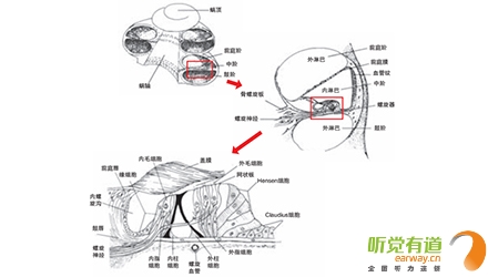 <span style="font-size:16px;"> 內耳或稱迷路,分為三個部分:半規管、前庭和耳蝸,負責聽覺的是耳蝸部分,外有骨殼,名骨迷路。耳蝸,顧名思義,像蝸牛殼一樣,耳蝸旋繞2.5~2.75圈。骨迷路的內壁被骨性螺旋板分成三部分,這三部分組成了三個錐形管腔(階),外面兩層含有淋巴液,頂部是前庭階,底部是鼓階,中間較小的三角形管腔是中階,又叫膜迷路,其中含有聽神經末梢分支。</span></p><p><span style="font-size:16px;"> </span></p><center><span style="font-size:16px;"><img alt="" src="/upfiles/20181116011946651.png" width="440" height="250" /></span></center><p></p><p><span style="font-size:16px;"> 骨迷路(右)</span></p><p><span style="font-size:16px;"> 鐙骨底板在卵圓窗里活動,振動了前庭階的外淋巴液。前庭階和鼓階在蝸孔相匯合,鼓階的另一端是圓窗,正好在卵圓窗和鐙骨底板的下方。中階被薄膜包裹,處于前庭階和鼓階之間,并與它們完全隔離。鐙骨底板在聲波的作用下,推動卵圓窗,使耳蝸內的淋巴液產生波動。顳骨很硬,淋巴液的壓力不能使之產生任何活動,因此,當鐙骨底板向里推動淋巴液時,淋巴液應有一個去處,圓窗部位就是淋巴液流動的方向。中階和前庭階有極薄的膜相隔離,而基底膜分隔中階和鼓階,基底膜是中階里螺旋器的根據地。中階的外壁由螺旋韌帶和微血管叢組成。血管叢可分泌內淋巴液,是內淋巴液化學成分的主要來源,內淋巴液是維持毛細胞功能的必要物質?;啄ど嫌兄е毎?、內毛細胞、外毛細胞和膠狀蓋膜等形成的螺旋器,又名Corti’s器。</span></p><p><span style="font-size:16px;"> </span></p><center><span style="font-size:16px;"><img alt="" src="/upfiles/201811160119529073.png" width="440" height="250" /></span></center><p></p><p><span style="font-size:16px;"> 耳蝸截面圖</span></p><p><span style="font-size:16px;"> 毛細胞是聽覺細胞,3500個內毛細胞和12000個外毛細胞很有序的排列著。普遍認為是外毛細胞比內毛細胞敏感35dB,因此更容易被大聲和耳毒藥物損害。蓋膜是一種膠狀物質,內側附在支持細胞上,其余部分覆蓋著毛細胞。毛細胞上的纖毛叢就埋在蓋膜里。淋巴液的波動或蓋膜的運動,可影響到毛細胞。淋巴液的波動使蓋膜產生猶如鋼琴鍵般的“剪切運動”,刺激毛細胞底部的神經末梢,產生神經沖動。耳蝸底部,離卵圓窗最近處,對高頻發生響應,耳蝸頂部,即遠離卵圓窗的地方,對低頻發生響應,中頻響應介于頂和底之間。</span></p><p><span style="font-size:16px;"> 更多詳情請登錄www.huiyoutank.com</span></p>" />