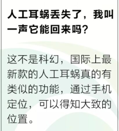 2019年4月10日這是一個新型的欄目<br /> 一本正經(jīng)地奇思妙想<br /> 內(nèi)容全靠一張圖<br /> 言語僅僅三兩句<br /> 大家隨便看看就行了<br /> 可一定得往心里去啊<br /><br /></span><div style="text-align: center;"><img src="/upfiles/20190410093258759.jpg" alt="" /></div> 嚴肅點:幾乎每個月,都有人工耳蝸丟失的事件發(fā)生,每一次都會成為該地方新聞的焦點。<br /> 無論我們多么小心,不經(jīng)意間的疏忽總會造成大麻煩。對于遺失耳蝸的家庭來說,一方面要承擔一筆不少的購機費用,另一方面會有一段時間的“聽力真空期”,我們不禁感嘆,要是耳蝸能自己報告位置就好了。<br /> 實際上這并非空想,國際某品牌人工耳蝸的最新設(shè)備已經(jīng)可以實現(xiàn)遺失位置定位,通過手機,我們可以找到處理器所在的大致位置(如果你有興趣,可以留言交流)。<br /> 5G時代,萬物互聯(lián),遺失定位也是未來人工耳蝸產(chǎn)品設(shè)計的趨勢之一,未來小伙伴們就可以體驗這種技術(shù)啦。<br /> 相關(guān)推薦閱讀:<a href="http://www.huiyoutank.com/listDetail.aspx?id=102609" target="_blank"><strong><span style="color:#3333ff;">保如果世界上沒有聽力設(shè)備:助聽器和耳蝸。</span></strong></a><br /><br /><br /> 聽覺有道助聽器價格:http://www.huiyoutank.com/products.html<br /><br /><br /> 發(fā)布于2019年4月10日 星期三<br /> 上午9:33分" />