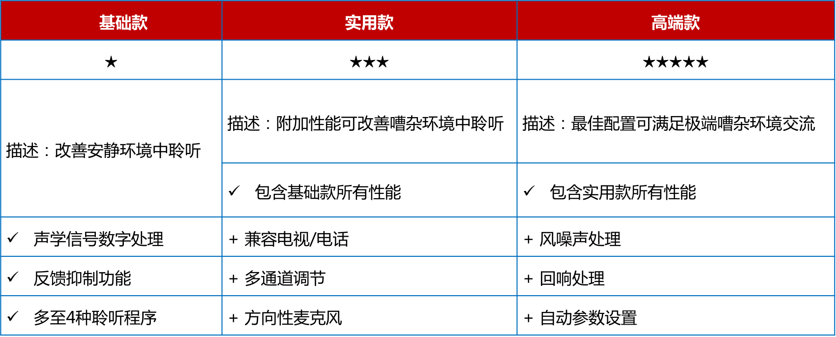 <span style="font-size:16px;"> 助聽器價格取決于機器的檔次,而檔次由內含的技術種類決定。助聽器檔次大致可分為基礎款、實用款、高端款。這三種檔次的區別請參見下表:</span></p><p style="text-align: center;"><span style="font-size:16px;"><img src="/upfiles/201808150226553383.png" width="640" alt="" /><br /></span></p><p><span style="font-size:16px;"> 那么,如何應該選擇哪種檔次的助聽器呢?</span></p><p><span style="font-size:16px;"> 選擇助聽器時主要需要考慮兩大因素。首先要考慮的就是弱聽人士的聽力損失程度,其次要考慮的就是弱聽人士的日常生活方式。比方說,某位弱聽人士是中度聽力損失,日常在家為主,那么實用款檔次助聽器通常可以滿足TA的需求。</span></p><p><span style="font-size:16px;"> 當然,這里只是為助聽器選配提供了大致方向,如何選配仍然需要具體情況具體分析,最好還是需要跟驗配師面對面溝通。</span></p><p><span style="font-size:16px;"> 1、高端款助聽器</span></p><p><span style="font-size:16px;"> 不同廠家的高端款助聽器均代表了各自的尖端技術,并致力于提供最佳的音質。</span></p><p><span style="font-size:16px;"> 這類助聽器高端之處在于自動適應各種聆聽環境,最優化佩戴者的聆聽清晰度和舒適度,讓佩戴者在極度嘈雜的環境中,如咖啡館,也能清晰地聽到同伴的言語聲。常見性能包括:</span></p><p><span style="font-size:16px;"> (1) 多種外觀、顏色可選;</span></p><p><span style="font-size:16px;"> (2) 環境自適應;</span></p><p><span style="font-size:16px;"> (3) 360°信號追蹤;</span></p><p><span style="font-size:16px;"> (4) 兼容各種藍牙設備。</span></p><p><span style="font-size:16px;"> 高端款助聽器為什么能夠自動適應各種聆聽環境呢?這是因為左右兩側的高端款助聽器能夠相互“通電報”,精準判斷所處的聆聽環境并自主學習,給出最佳的助聽設置。</span></p><p><span style="font-size:16px;"> 比如,您經常出入一家書店,每次您進入這家書店時總是習慣性地將音量調低2分貝;長此以往,當您再次進入該書店時,兩臺助聽器將會默契地降低2分貝。</span></p><p><span style="font-size:16px;"> 360°信號追蹤可以幫助佩戴者建立更佳的空間感知,對所處環境有充足的把控和預判,避免一些潛在的危險。而當助聽器連接至各種藍牙設備時,聆聽清晰度會更高,且不會打擾其他人。</span></p><p><span style="font-size:16px;"> 比如家人總是抱怨您把電視機聲音開得太大,拒絕跟您一起觀看電視時,您可以選配能夠兼容電視的助聽器,并進行獨立的音量調節,而家人只需設置為常規音量即可。高端款助聽器的價位一般在15000以上。</span></p><p style="text-align: center;"><span style="font-size:16px;"><img src="/upfiles/201808150228328500.jpg" alt="" /><br /></span></p><p><span style="font-size:16px;"> 2、實用款助聽器</span></p><p><span style="font-size:16px;"> 實用款助聽器的價格一般在8000~15000之間。實用款助聽器包含一定的降噪技術和言語提升功能,可以滿足大多數環境中的聆聽需求。部分廠家的實用款助聽器也可兼容各種藍牙設備。實用款助聽器的突出性能大致包括:</span></p><p><span style="font-size:16px;"> (1) 可連接外接音源;</span></p><p><span style="font-size:16px;"> (2) 言語清晰度提升;</span></p><p><span style="font-size:16px;"> (3) 方向性功能。</span></p><p><span style="font-size:16px;"> 3、基礎款助聽器</span></p><p><span style="font-size:16px;"> 基礎款助聽器的價位一般在8000以下。基礎款助聽器能夠滿足安靜環境中的交流需求,并具備反饋管理功能。反饋管理功能能夠有效提升佩戴舒適度,避免在日常佩戴過程中出現尖銳的干擾聲。</span></p><p><span style="font-size:16px;"> 基礎款助聽器適用于經常在家的弱聽人士,若是生活方式比較豐富多彩的弱聽人士建議選配其他檔次的助聽器。實用款助聽器的突出性能大致包括:</span></p><p><span style="font-size:16px;"> (1) 數字信號處理技術;</span></p><p><span style="font-size:16px;"> (2) 反饋管理功能;</span></p><p><span style="font-size:16px;"> (3) 多種聆聽程序可選。</span></p><p><span style="font-size:16px;"> 更多詳情請登錄www.huiyoutank.com。</span></p>" />
