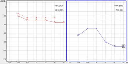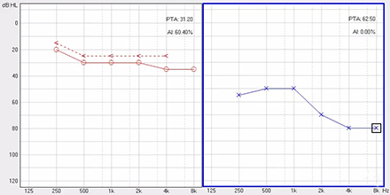 <span style="font-size:16px;"> 純音聽閾測試是聽力學所有測試項目中最基本的一項內容,包括氣導(AC)、骨導(BC)、最舒適閾(MCL)與不舒適閾(UCL)測試。測試結果能夠直接反映患者雙耳的聽力損失程度、性質與動態范圍,還能夠間接反映患者的患病位置、病因與助聽后效果。</span></p><p><span style="font-size:16px;"> 一般地,整個檢查控制在10分鐘左右,既能全面做完檢查,又不至患者疲憊而影響主觀反應。</span></p><p><span style="font-size:16px;"> 純音聽閾測試是最考驗聽力學工作者實際工作能力的一項基本內容:</span></p><p><span style="font-size:16px;"> 1、若患者曾長期暴露于噪聲中,且無其它致使聽損因素,很可能在3 kHz或6 kHz出現明顯的下降,聽力曲線呈現“V”字形,所以除了常規的倍頻程頻率外,還要加測這兩個頻率,否則就犧牲了多通道助聽器的意義;</span></p><p><span style="font-size:16px;"> 除了有過噪聲接觸史的患者需要加測半倍頻程外,涉及聲場助聽聽閾評估、賠償等情況都需要加測半倍頻程。</span></p><p><span style="font-size:16px;"> 耳鳴困擾的患者,注意避免與耳鳴聲類似的純音,若還用純音作為刺激聲,患者就會分辨不清,出現假陽性或假陰性。所以,測試者要換成囀音,既有別于耳鳴聲,又具有頻率特異性。</span></p><p><span style="font-size:16px;"> 2、不舒適閾反映患者對大聲的忍耐力,不舒適閾與氣導的差值能顯示患者的動態范圍,指導驗配師調節助聽器的最大輸出。</span></p><p><span style="font-size:16px;"> 不舒適閾測試頻率是否越多越好呢?非也。測得頻率過多,一會引起患者疲勞或不適,二是沒必要,大多數助聽器的最大輸出是一個整體,不能像調增益和壓縮那樣分通道,所以測多了并無好處,一般測0.5、1、2、4 kHz。</span></p><p><span style="font-size:16px;"> 3、如果兩側聽力有明顯差異,此時就要準備好掩蔽了,分為氣導掩蔽與骨導掩蔽。</span></p><p><span style="font-size:16px;"> (1)氣導掩蔽的判斷有兩個原則,只要符合其中一個原則,就需要重新測差耳氣導。具體做法是:</span></p><p><span style="font-size:16px;"> 測試完雙耳氣導,若發現某一頻率差耳氣導閾值比好耳氣導閾值多40 dB以上就要懷疑有可能是好耳偷聽的,需要給好耳氣導加掩蔽聲;</span></p><p><span style="font-size:16px;"> 測試完雙耳氣導與好耳骨導,若發現某一頻率差耳氣導閾值比好耳骨導閾值多40 dB以上就要懷疑有可能是好耳偷聽的,需要給好耳氣導加掩蔽聲。</span></p><p><span style="font-size:16px;"> 下面為未掩蔽的聽力圖:</span></p><center><span style="font-size:16px;"><img alt="" src="/upfiles/201809180234471614.png" width="440" height="220" /></span></center><p></p><p><span style="font-size:16px;"> 下圖為掩蔽后的左耳真實氣導值:</span></p><center><span style="font-size:16px;"><img alt="" src="/upfiles/201809180234541797.png" width="440" height="220" /></span></center><p></p><p><span style="font-size:16px;"> (2)骨導掩蔽的判斷原則:</span></p><p><span style="font-size:16px;"> 測試完雙耳氣導與好耳骨導,若發現某一頻率差耳氣導閾值比好耳骨導閾值大于等于15 dB就必須予以掩蔽,重測骨導。下圖為右耳氣導加掩蔽后左耳骨導的真實值:</span></p><center><span style="font-size:16px;"><img alt="" src="/upfiles/201809180235004928.png" width="440" height="220" /></span></center><p></p><p><span style="font-size:16px;"> 注意:</span></p><p><span style="font-size:16px;"> 1)掩蔽的規則要按順序適用;</span></p><p><span style="font-size:16px;"> 2)各頻率根據規則決定是否需要加掩蔽;</span></p><p><span style="font-size:16px;"> 3)很少需要掩蔽所有頻率,通常氣導掩蔽頻率不應超三個,骨導掩蔽頻率不應超兩個,否則受試者會疲憊不堪。</span></p><p><span style="font-size:16px;"> 醫院測聽的主要目的是診斷和鑒別聽力損失的性質和程度,驗配中心的主要目的是盡可能地幫助患者選擇并調試好助聽器。</span></p><p><span style="font-size:16px;"> 更多詳情請登錄www.huiyoutank.com</span></p>" />