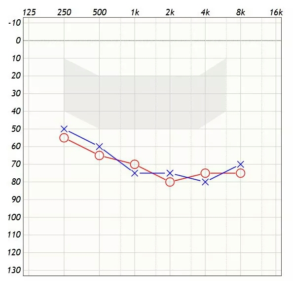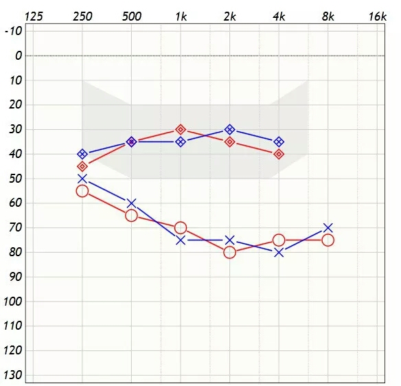 什么是助聽聽閾?簡單一句話,人耳佩戴助聽裝置(助聽器、人工耳蝸等)后能聽到的最小聲音強度就是助聽聽閾。我們都知道沒有帶助聽器時做聽力檢測(純音測聽,通常佩戴壓耳式耳機測試),可以獲得得一個圖一所示的聽力圖(氣骨導閾值),稱為裸耳聽閾。