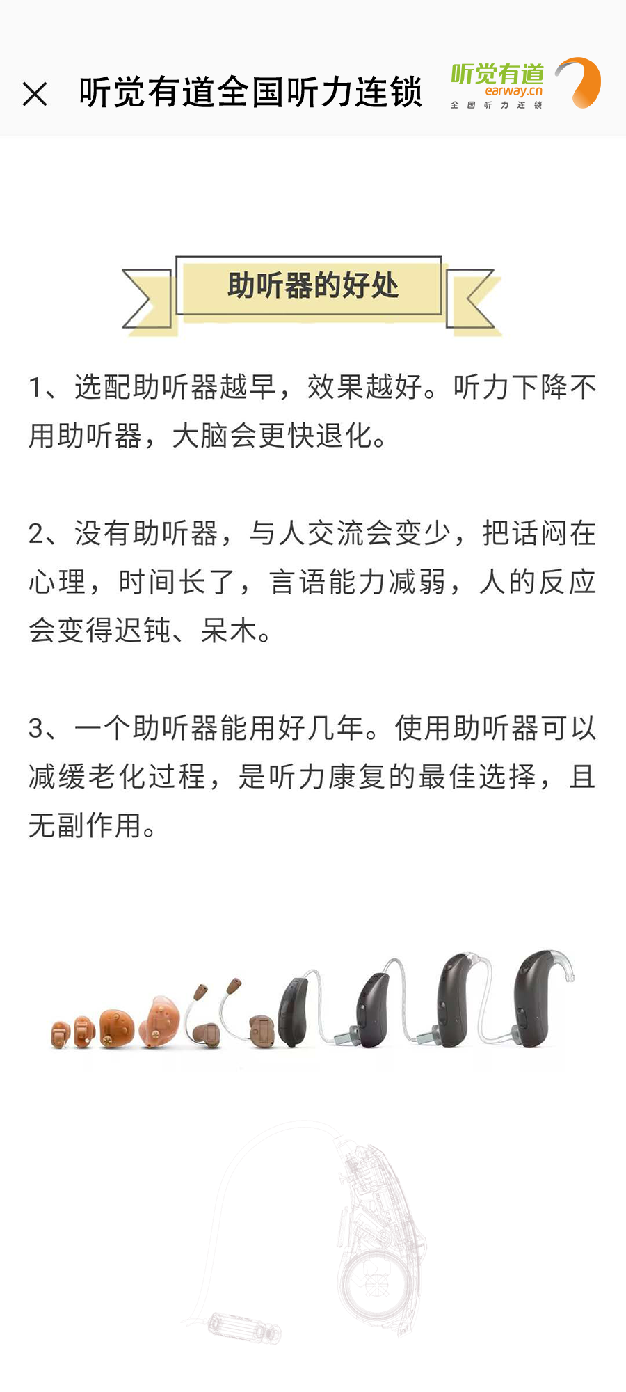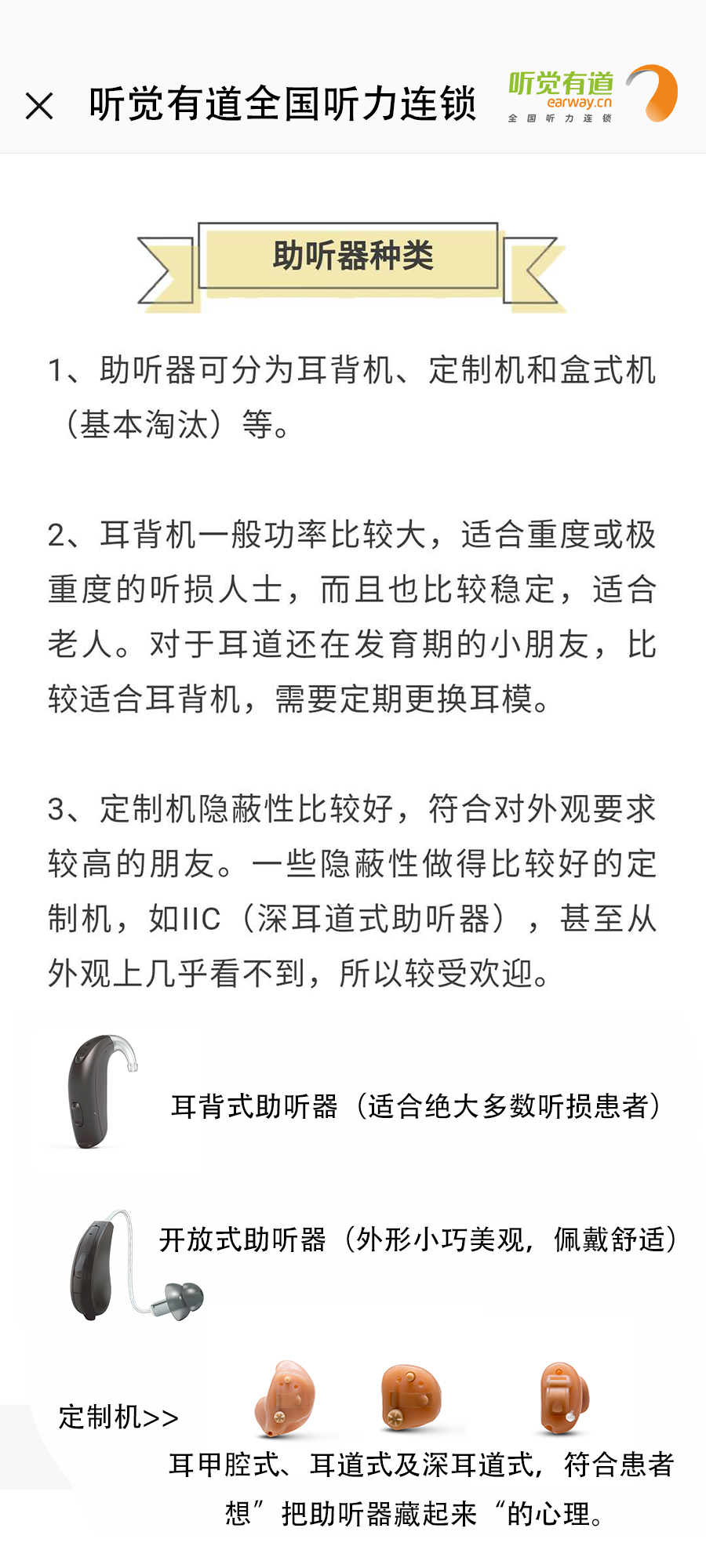 什么是助聽器?長什么樣子?有什么作用?如何使用?這里一一告訴您!</p><p> 助聽器是聽力障礙者使用的輔具,用來補足聽力損傷所造成的缺陷。廣義上講凡能有效地把聲音傳入耳朵的各種裝置都可以看作為助聽器,狹義上講助聽器是一個電聲放大器,通過它將聲音放大,使聽障者聽到了原來聽不清楚、聽不到的聲音。</p><p> 第一:助聽器的種類</p><p style="text-align: center;"><img src="/upfiles/201901180318143583.jpg" width="640" alt="" /><br /></p><p> 第二:助聽器的好處</p><p style="text-align: center;"><img src="/upfiles/201901180318334139.png" width="640" alt="" /><br /></p><p> 第三:如何適應助聽器</p><p style="text-align: center;"><img src="/upfiles/201901180318506440.jpg" width="640" alt="" /><br /></p><p> 第四:選配助聽器流程</p><p style="text-align: center;"><img src="/upfiles/201901180319039646.jpg" width="640" alt="" /><br /></p><p style="text-align: center;"><br /></p><p> 更多詳情請登錄www.huiyoutank.com</p>" />