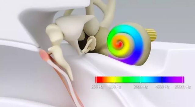不同頻率的聲音分別由耳蝸的不同位置來感知。