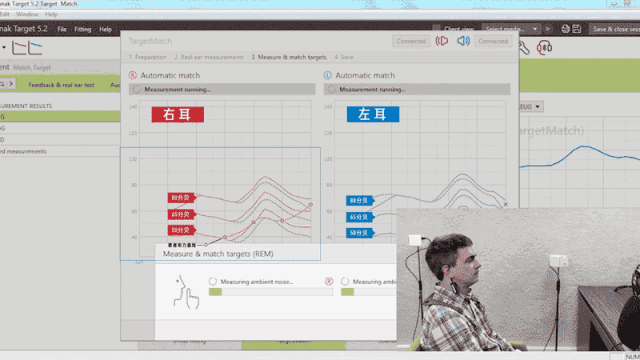 接著,患者面前的音響會播放一段 50 分貝的語音,這時,耳朵中的探管麥克風就能接收到助聽器放出的實際音量,也就是這條綠線。