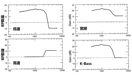在低通放大中,低頻有一定的增益,而高頻則有一些插入缺失(負(fù)增益);在高通放大中,低頻增益為零,高頻增益最多;在寬頻放大中,低、高頻都有增益,其中低頻有較大增益高頻,高頻有相對(duì)較少的增益;在K-Bass放大中,低頻增益明顯,高頻增益為零,剛好彌補(bǔ)插入缺失。