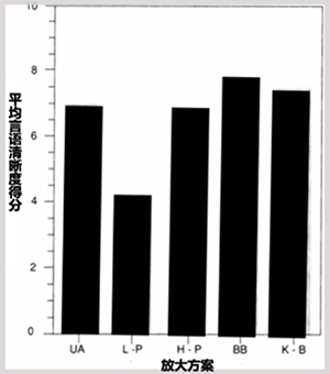 我們發(fā)現(xiàn)沒有補(bǔ)償(UA),寬頻(BB),高通(HP),K-Bass(KB)的平均言語清晰度都大于低通(LP)的平均言語清晰度。