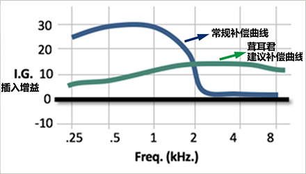 所以,基于循證驗(yàn)配,在調(diào)試上升型聽力損失時(shí),建議:在高頻給予至少10dB-15dB的插入增益,確保弱聽人士在高頻能夠聽到聲音,并適當(dāng)減少低頻增益,如下圖中的綠色補(bǔ)償曲線。