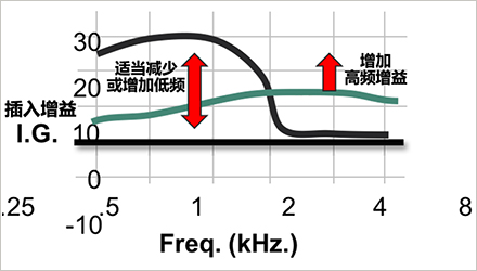 所以,在此建議可以逐步減少低頻增益(部分可適當(dāng)增加低頻),增加高頻增益,慢慢調(diào)試,直到弱聽人士覺得合適,如下圖綠色曲線的紅箭頭所示。