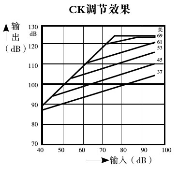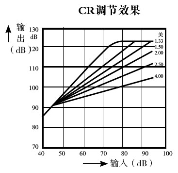 4)CK—壓縮拐點(diǎn)/CR——壓縮比:是壓縮線路獨(dú)有的微調(diào)。自動(dòng)增益壓縮控制(AGC)是一種反饋裝置,能自動(dòng)降低助聽(tīng)器的增益而不引起失真,從而限制助聽(tīng)器輸出。一旦自動(dòng)增益壓縮控制起作用,在輸入和輸出之間就會(huì)建立起新的線性關(guān)系。壓縮拐點(diǎn)是壓縮起效所需要的最小輸入聲壓級(jí),拐點(diǎn)設(shè)置得越高,助聽(tīng)器就越接近線性放大;壓縮比為壓縮啟動(dòng)后,輸入變化量與輸出變化量之比,壓縮比的絕對(duì)值越大,表明增益越小,當(dāng)壓縮比等于1:1時(shí)表示線性放大。