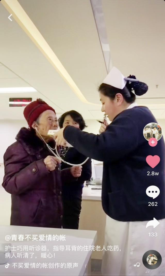 一條護士用聽診器當“臨時助聽器”,為一位耳背老奶奶講解用藥方法的抖音視頻在網上熱傳。