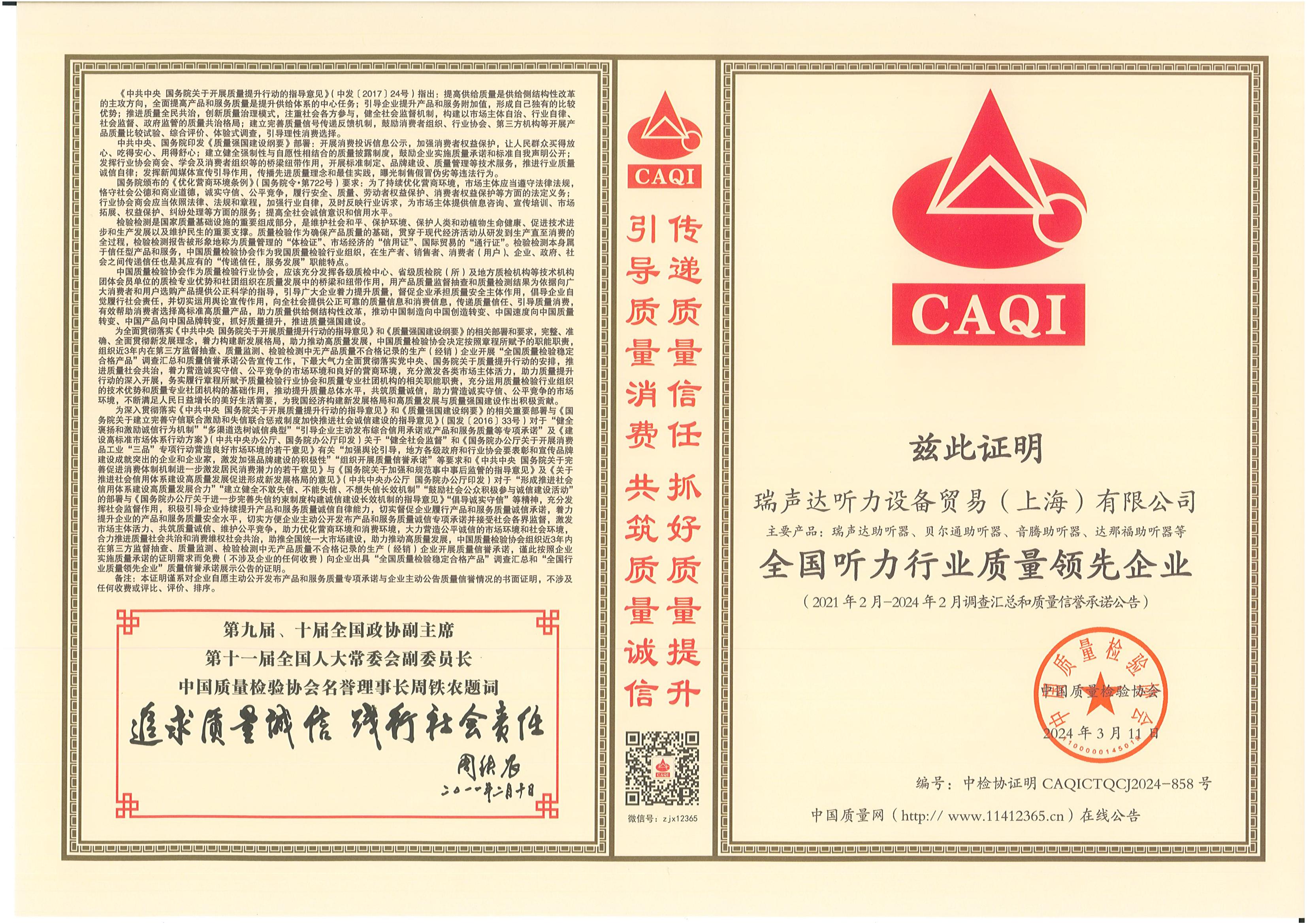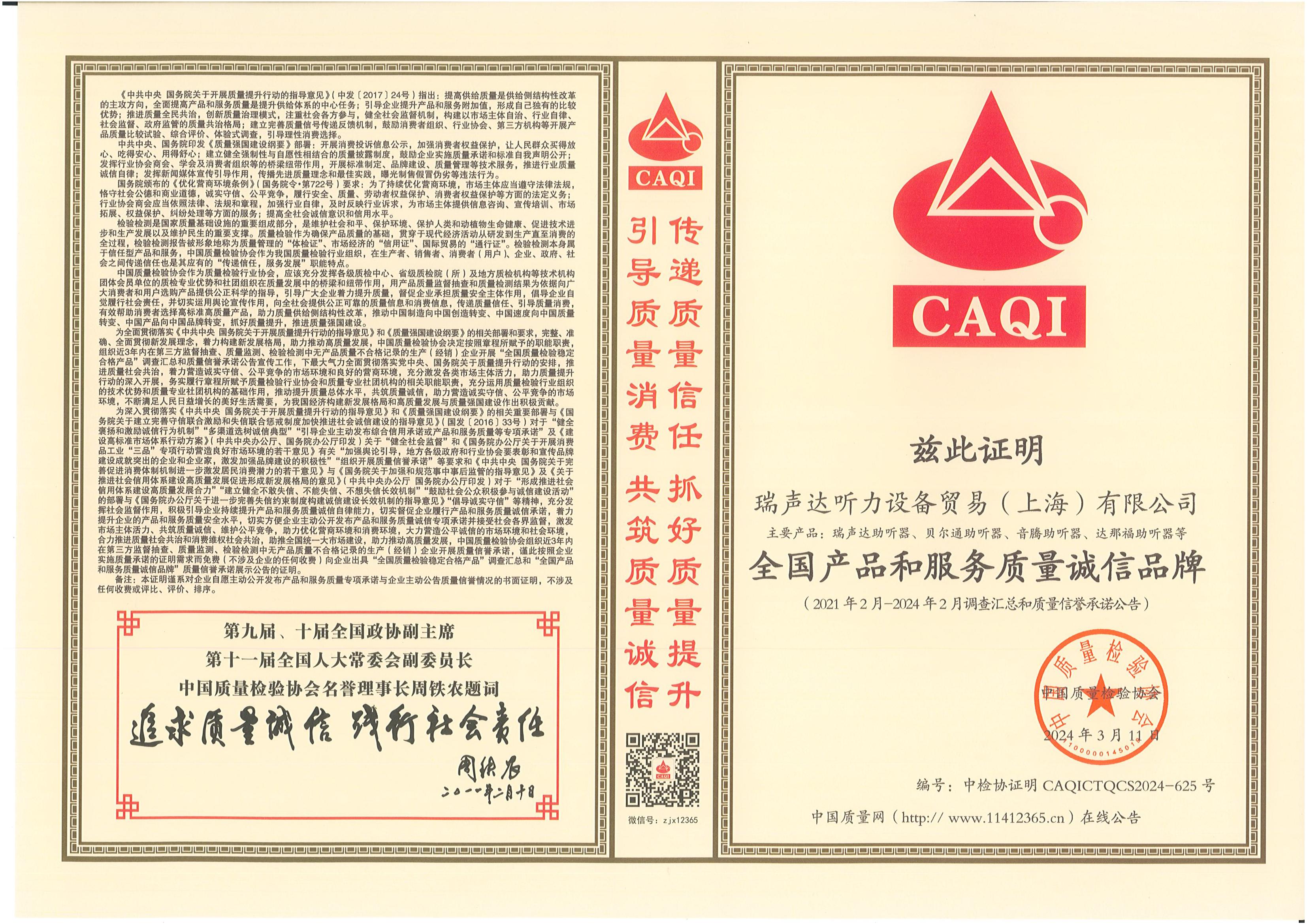 <span style="white-space:pre"> </span>2024年3月15日,是第42個國際消費者權益日,是全體消費者的共同節日。今年全國消協組織消費維權年主題是“激發消費活力”。<br /><br /> 作為對貝爾通助聽器產品的肯定,2024年中國質量檢驗協會再次頒發了四項榮譽證書,以期能引導用戶選擇高標準高質量的產品,優化消費環境,保護消費者權益。<br /></span><div style="text-align: center;"><br /></div><div style="text-align: center;"> 全國產品和服務質量誠信示范企業</div><p style="text-align: center;"><span style="font-size:16px;"><img src="/upfiles/202403150116348998.jpg" width="640" alt="" /><br /></span></p><p style="text-align: center;"><span style="font-size:16px;"> 全國聽力行業質量領先企業</span></p><p style="text-align: center;"><span style="font-size:16px;"><img src="/upfiles/202403150116524189.jpg" width="640" alt="" /><br /></span></p><span style="font-size:16px;"></span><div style="text-align: center;"><br /></div><p style="text-align: center;"><span style="font-size:16px;"> 全國消費者質量信譽保障產品</span></p><p style="text-align: center;"><span style="font-size:16px;"><img src="/upfiles/202403150117168442.jpg" width="640" alt="" /><br /></span></p><span style="font-size:16px;"></span><div style="text-align: center;"><br /></div><p style="text-align: center;"><span style="font-size:16px;"> 全國產品和服務質量誠信品牌</span></p><p style="text-align: center;"><span style="font-size:16px;"><img src="/upfiles/202403150117523284.jpg" width="640" alt="" /><br /></span></p><span style="font-size:16px;"><br /> 中國質量檢驗協會是國家市場監督管理總局主管下的質量檢驗行業組織和質量專業機構,為充分發揮名優企業、消費者之間的橋梁和紐帶作用,向廣大消費者提供權威可靠的質量信息,切實維護廣大名優產品生產企業及消費者的合法權益。<br /><br /> 中國質量檢驗協會連續多年頒發榮譽證書,不僅代表著對貝爾通助聽器產品質量的肯定,這同時也是一份承諾和職責,督促著我們持續為聽損用戶提供優質的產品和服務!</span>" />